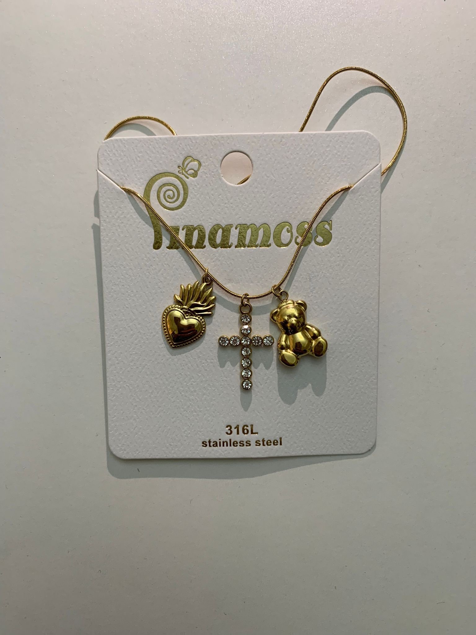 Collana in acciaio inox color oro con tre ciondoli luminosi e originali: un cuore fiammeggiante, una croce interamente tempestata di strass e un dolcissimo orsetto dorato. Un mix di amore, fede e dolcezza, perfetto per chi ama esprimere la propria personalità con stile. Resistente, è sempre alla moda.