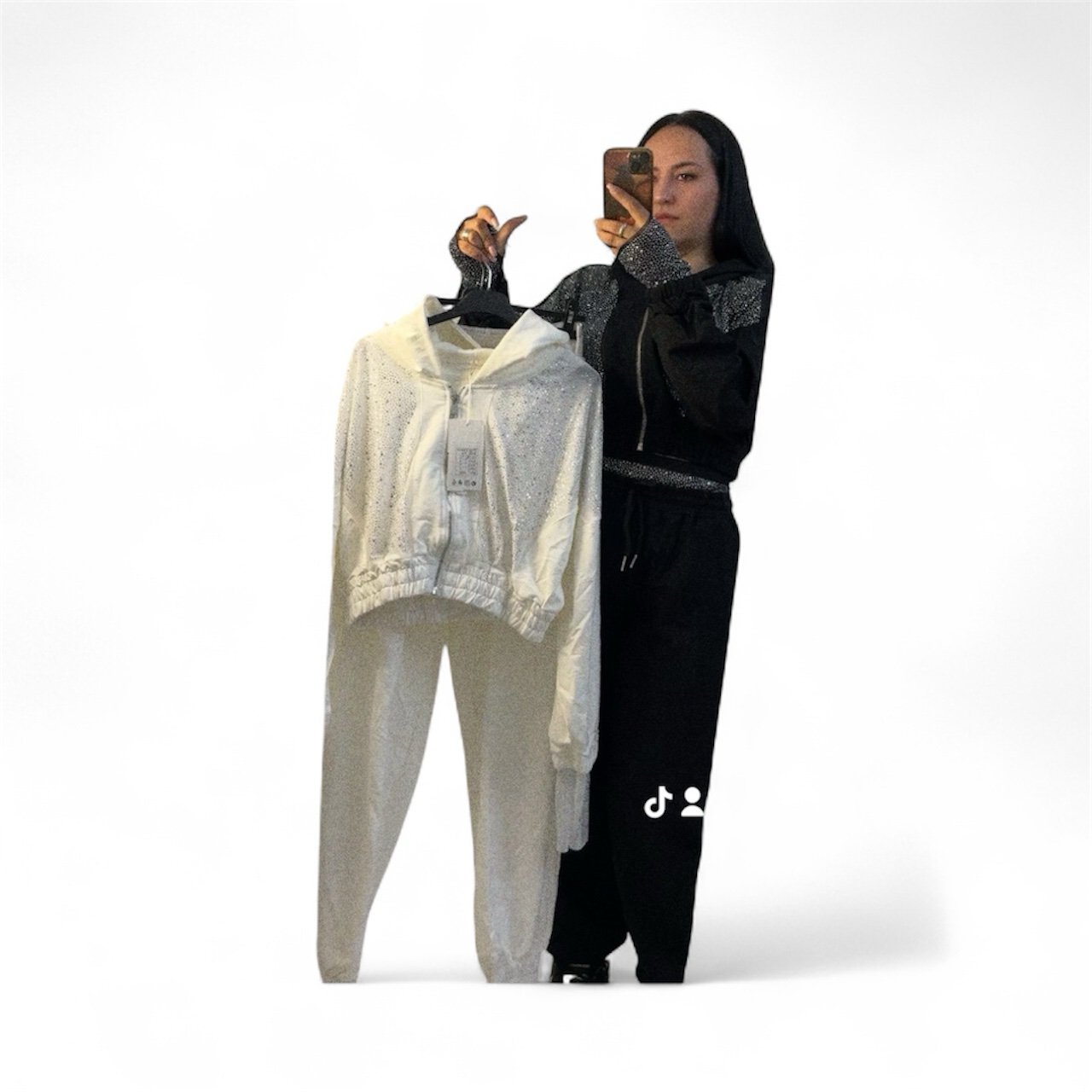 Tuta completa dallo stile sportivo ma super glam, composta da felpa in cotone con cappuccio e dettagli brillantinati sulle spalle e maniche a guanto, per un tocco chic. Il pantalone ha elastico alla caviglia, garantendo comfort e vestibilità perfetta. Disponibile in bianco e nero, è il perfetto mix tra comfort e luminosità.