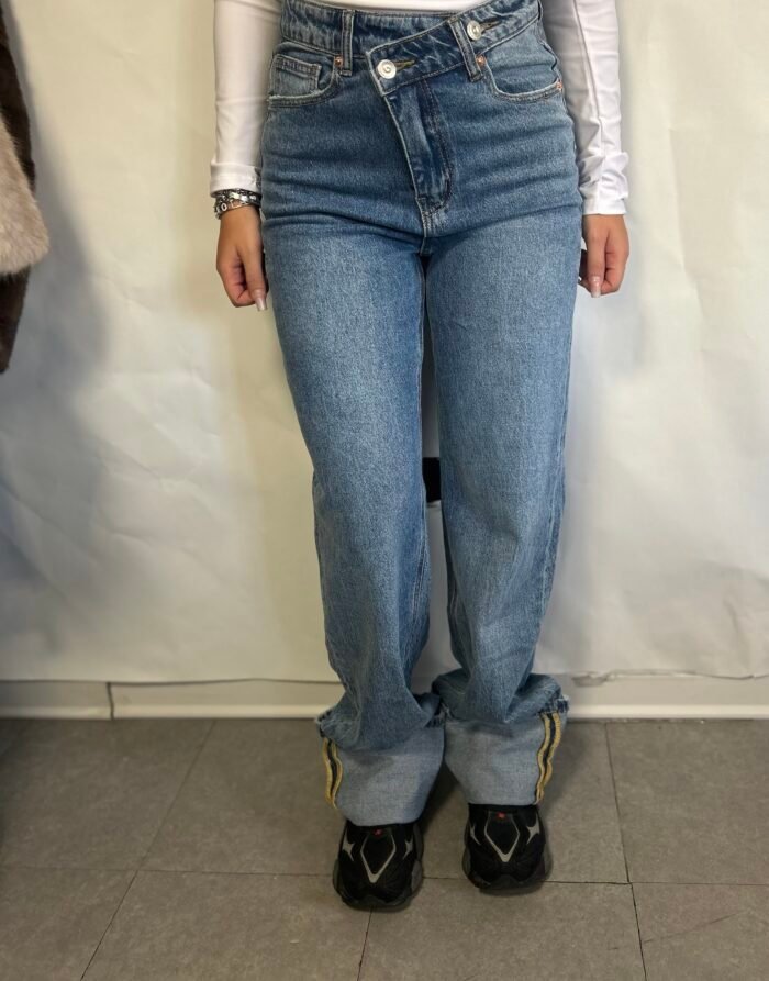 Jeans *elasticizzato* a vita alta con *chiusura frontale a cinque bottoni gioiello* e risvolto alla caviglia. Modello *slim morbido* che valorizza la silhouette senza costringere, ideale per look casual chic con un tocco luminoso.