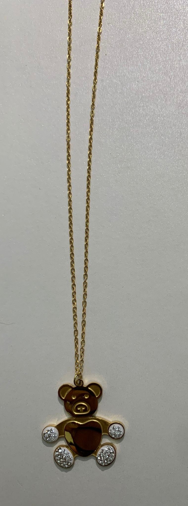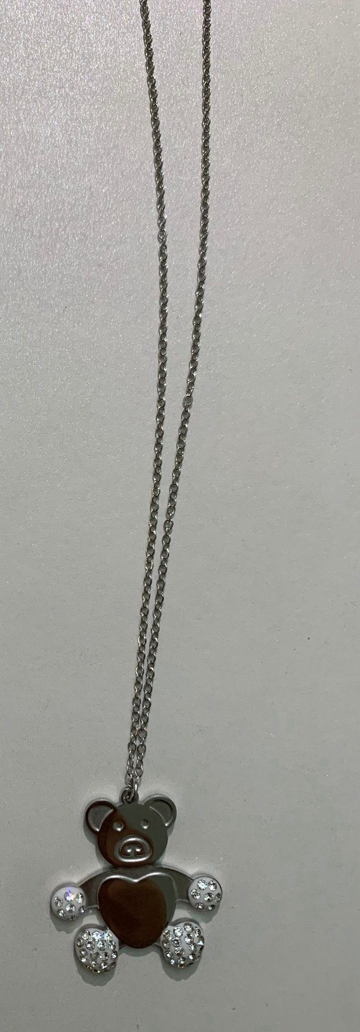 Collana in acciaio inossidabile con ciondolo a forma di orsetto stilizzato, impreziosito da inserti di strass scintillanti sulle zampe. Il corpo a cuore aggiunge un tocco affettuoso e giocoso. Perfetta per chi ama gli accessori teneri ma con un tocco glamour.