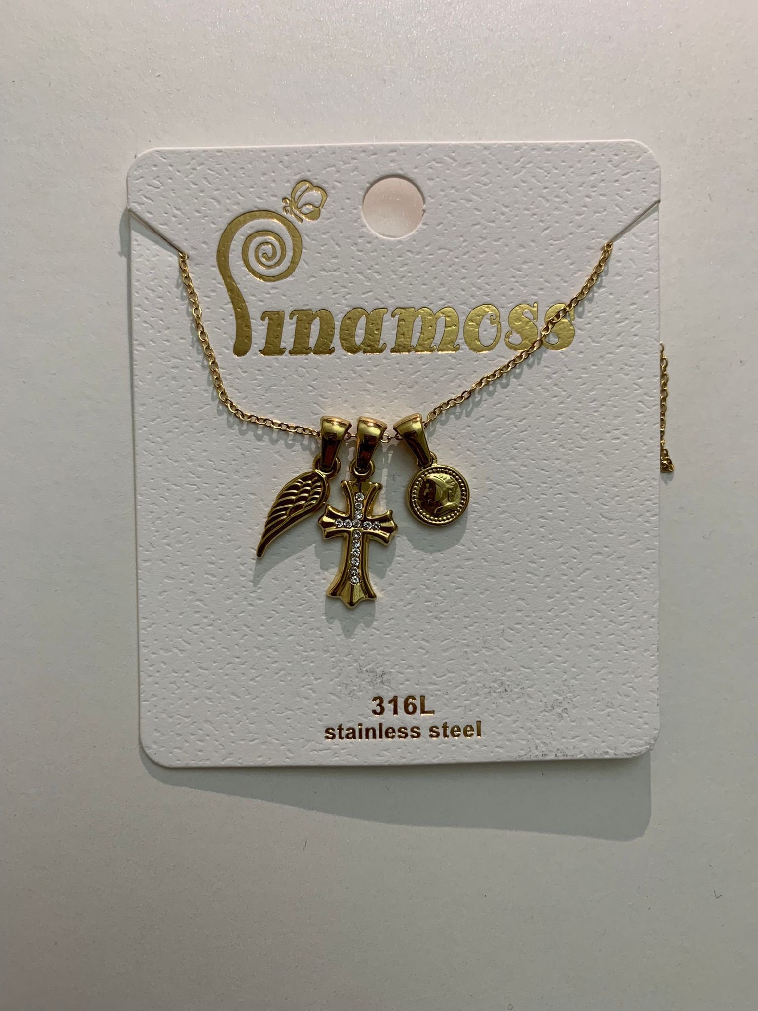 Collana in acciaio inox color oro con tre ciondoli simbolici: un’ala d’angelo, una croce impreziosita da strass e una medaglietta con incisione religiosa. Un mix perfetto di spiritualità, protezione e stile. Resistente all’acqua,e ideale da indossare ogni giorno come amuleto di luce e fede.