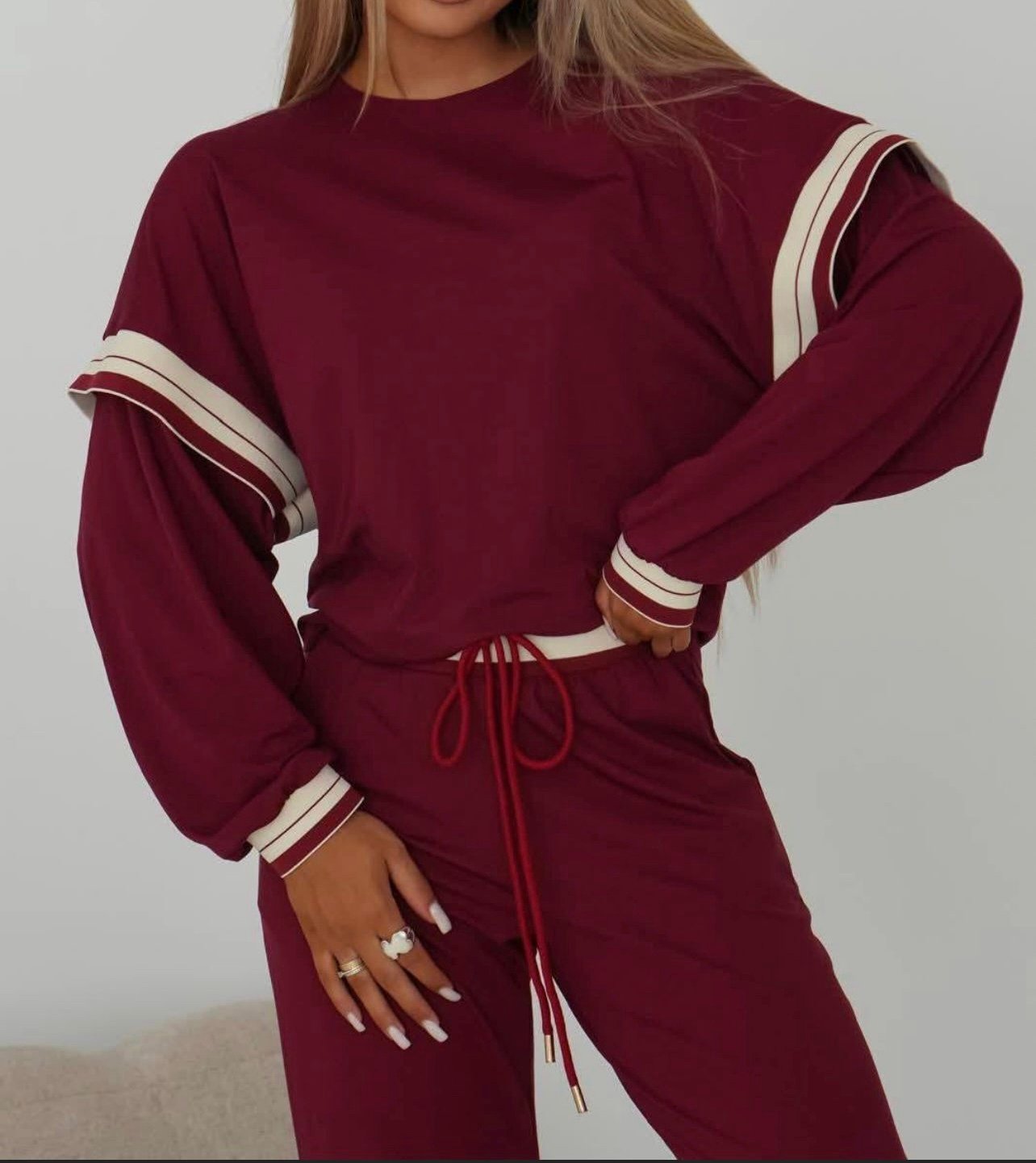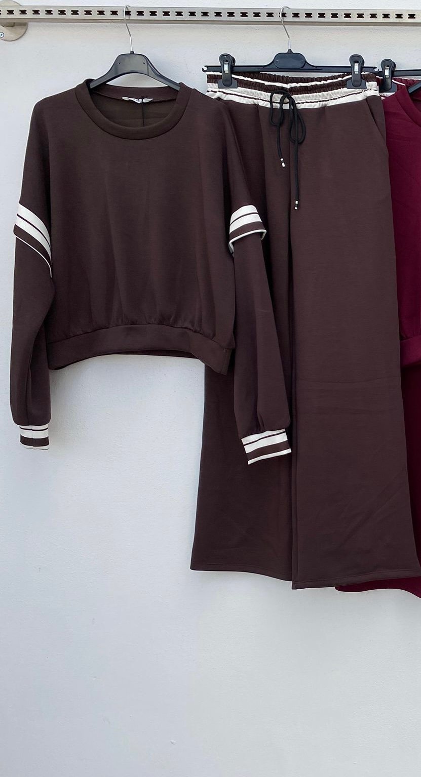 Tuta due pezzi in tessuto fluido e confortevole, pensata per unire stile e comodità. La felpa presenta dettagli a contrasto color panna su spalle e polsini, con maniche morbide e taglio leggermente over. Il pantalone a vita alta ha una vestibilità rilassata con coulisse in vita e gamba dritta, perfetta sia per il tempo libero che per un look streetwear sofisticato.